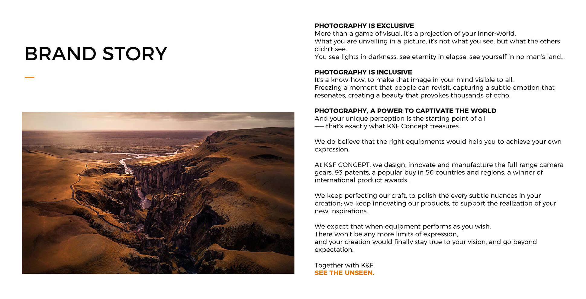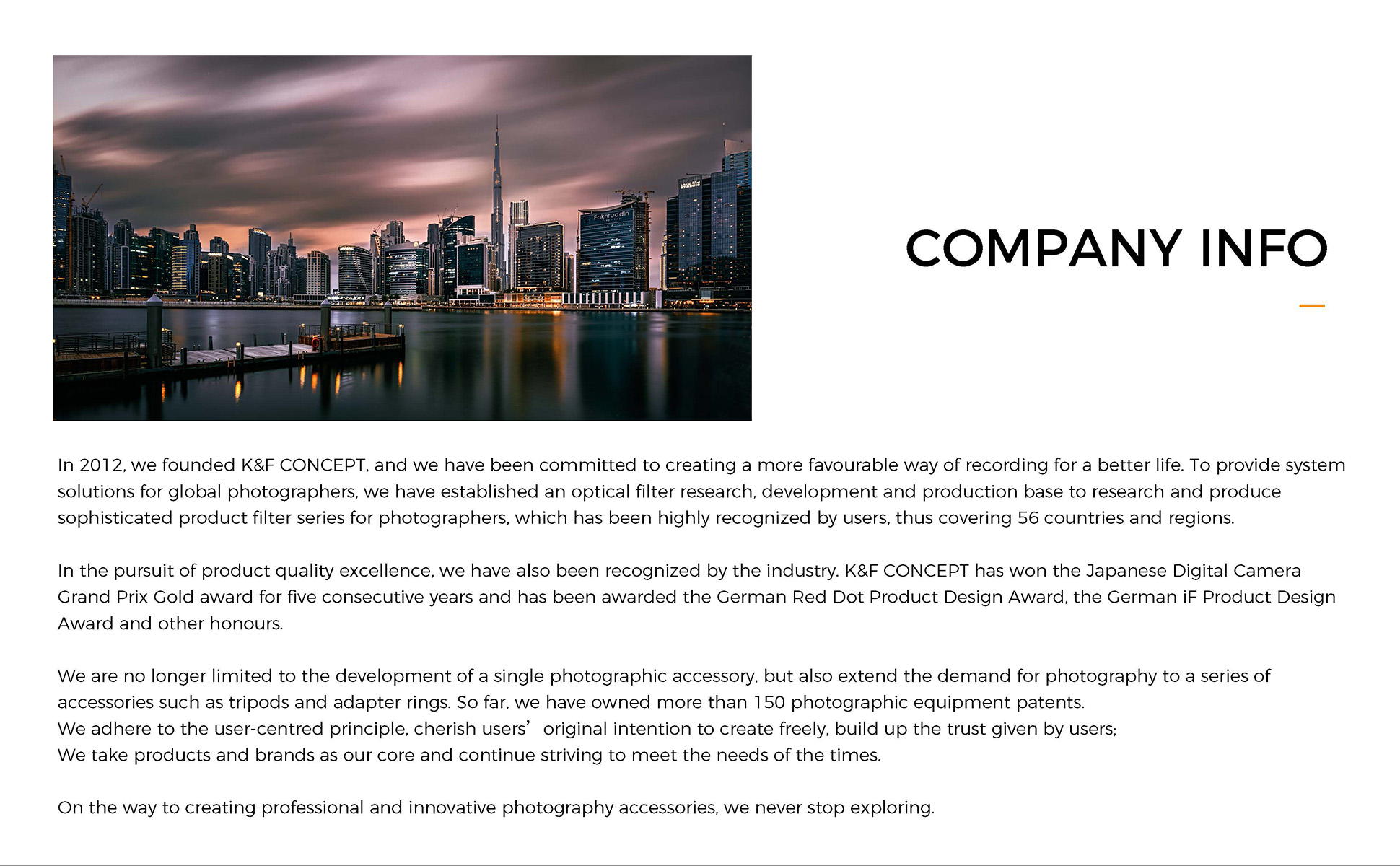 K&F Concept is dedicated to creating professional, innovative camera accessories and providing friendly, responsive service to satisfy our valued customers from around the world. We hold 93 patents, are sold in 56 countries and regions, and have won international product awards.