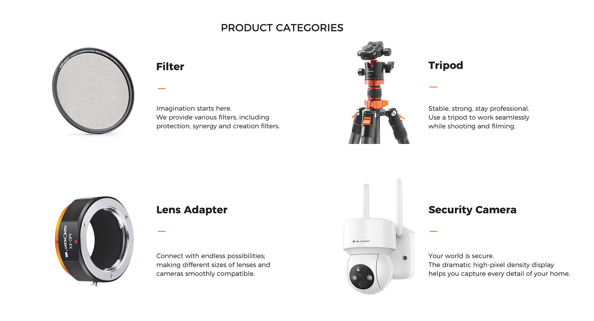 K&F Concept specializes in the design, research, manufacturing and marketing of photographic and video equipment, including camera tripods, camera lens filters, camera bags, trail cameras, surveillance cameras and other essential photography accessories.