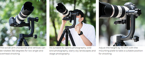 • * ��Multi-angle adjustment�� You can use the scale to slide up and down within the 70mm lifting range to adjust the shooting height and field of view, allowing you to accurately locate the center of gravity of any lens and camera system.