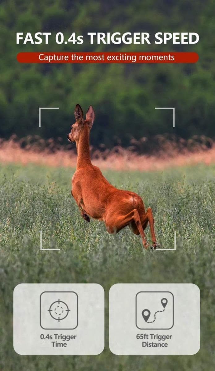 - ��Fast Trigger Speed and 60ft Trigger Distance��: Once detecting movements, the game camera will be activated in 0.6s to capture the best moment! 60feet detecting distance allows you to get a broader view!