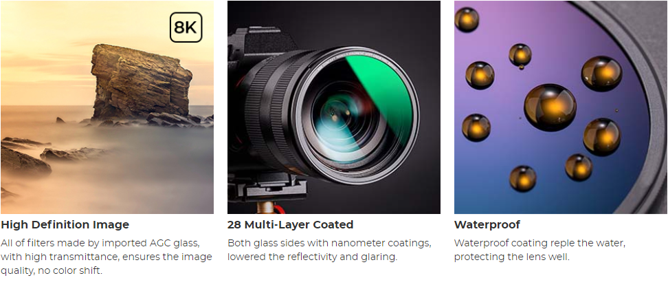 - * ��28 Multi-Layer Coatings��All filters are made of imported AGC high-definition premium optical glass, double-side multicoated, no chromatic aberration (color shift) waterproof, scratch resistant, and dustproof. Provides you with a perfect photography experience, protecting your lens from all around.