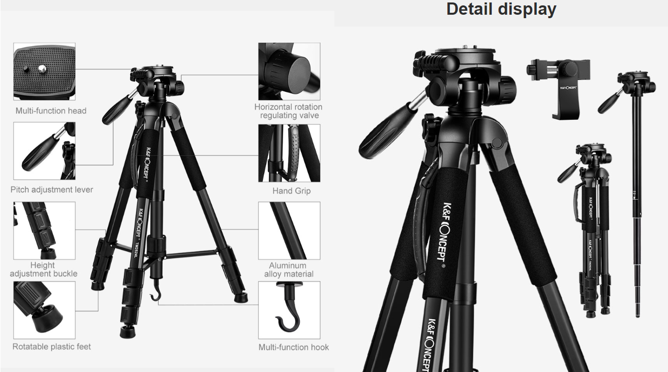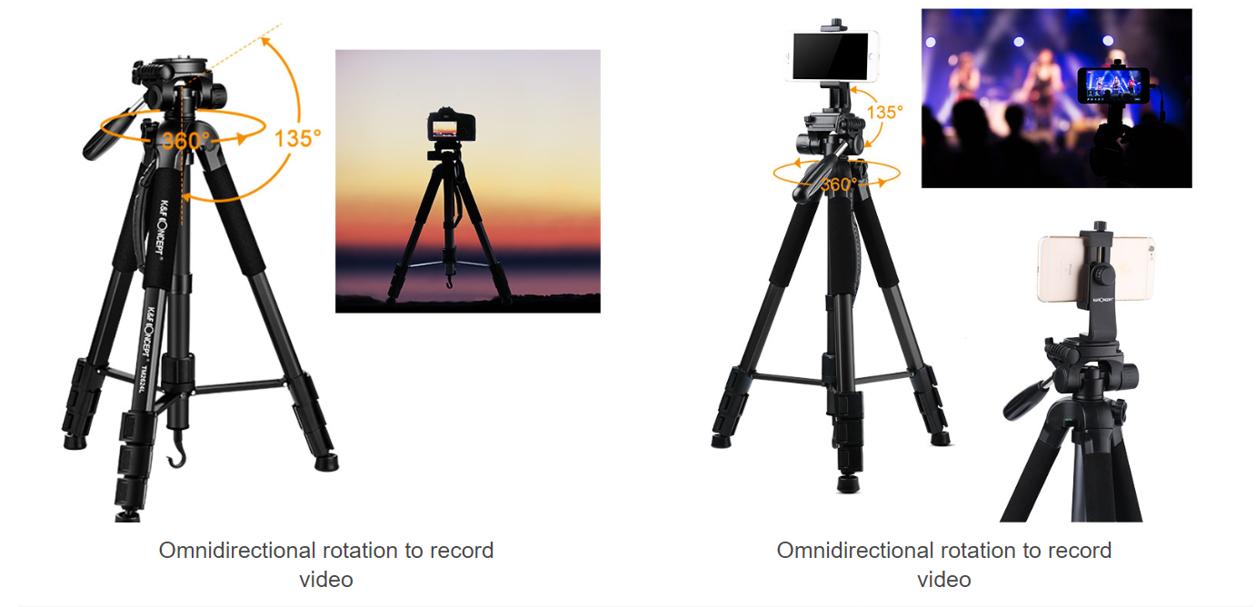 • * 【360° Panoramic Rotation & Wide Compatibility】 K&F Concept Camera Tripod allows you to take photos at any angle in horizontal and vertical directions, making it easy to take panoramic photos and video shooting; Accurate panoramas can be easily orchestrated; With Standard 1/4" Screw Mount Compatible for all Digital Cameras, Lenses, most Camcorders, GoPro devices, Binocular, Telescopes.