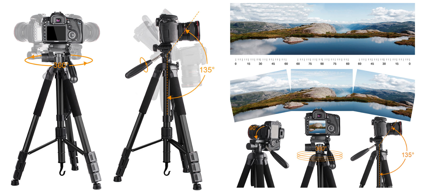 Allows you to take photos at any angle in horizontal and vertical directions, making it easy to take panoramic photos and video shooting;Accurate panoramas can be easily orchestrated;With Standard 1/4" Screw Mount Compatible for all Digital Cameras, Lenses, most Camcorders, GoPro devices, Binocular, Telescopes.