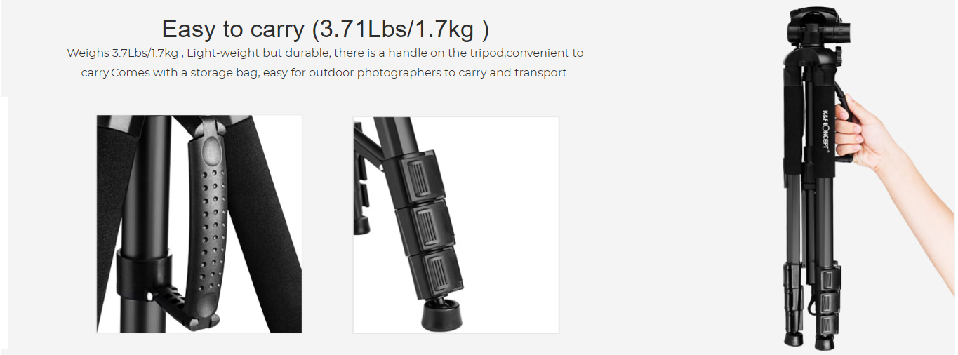• * 【Compact & Portable】 The sturdy yet lightweight tripod weighs 3.7Lbs/1.7kg. There is a handle on the tripod, making it convenient to carry around. It also comes with a storage bag, easy for outdoor photographers to carry and transport.