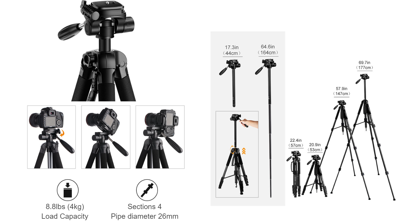 • * 【Detachable Monopod】 The camera tripod can be converted to a monopod in seconds with height ranges from 16.1"/41cm to 57.9"/147cm.