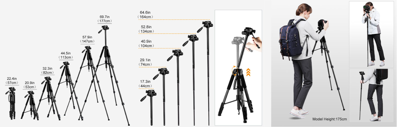 • * 【Wide Height Ranges 20.9"-70"】 K&F Concept Camera Tripod features 4 Sections Legs,5 different height adjustment options, and quick-acting locking, height from 20.9"/53cm to 70"/177cm, with the extended center column to meet your needs High demand for shooting.